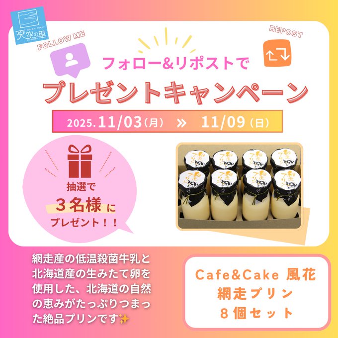 賞品:Cafe&Cake風花の「網走プリン8個セット」(3名様)