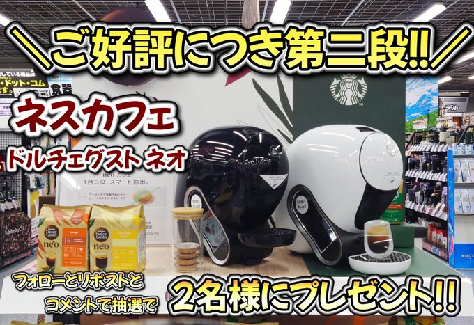 【X懸賞】ネスレ ドルチェグストネオを2名様にプレゼント 2025.11.07ヨドバシ さいたま新都心駅前店‐プレゼントキャンペーン 賞品:ネスレ ドルチェグストネオ(2名様) 締切:2025年11月9日(日)①フォロー&投稿をリポスト🔃 ②ブラック派?砂糖orミルク派?※詳細はキャンペーンページにてご確認ください。応募はこちらから