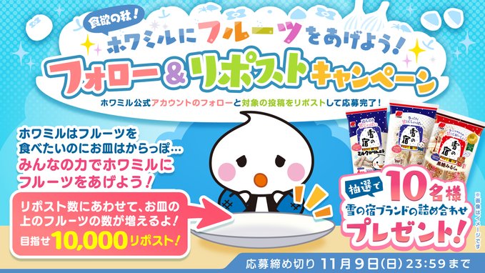 【X懸賞】雪の宿ブランドの詰め合わせを10名様にプレゼント 2025.11.07ホワミルにフルーツをあげよう 賞品:雪の宿ブランドの詰め合わせ(10名様) 締切:2025年11月9日(日)公式X(Twitter)アカウントをフォロー&キャンペーン対象ポストをリポストしてご応募ください。※詳細はキャンペーンページにてご確認ください。応募はこちらから