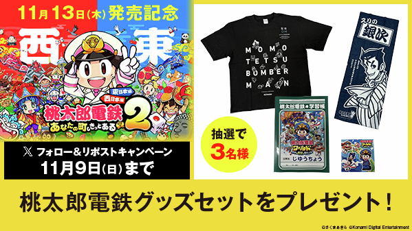 【X懸賞】桃太郎電鉄グッズセットを3名様にプレゼント 2025.11.07ゲオ‐フォロー&リポストキャンペーン 賞品:桃太郎電鉄 グッズセット(3名様) 締切:2025年11月9日(日)公式X(Twitter)アカウントをフォロー&キャンペーン対象ポストをリポストしてご応募ください。※詳細はキャンペーンページにてご確認ください。応募はこちらから