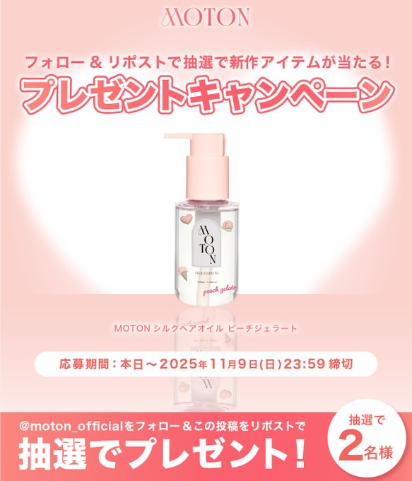 【X懸賞】シルクヘアオイルを2名様にプレゼント 2025.11.08 2025.11.07MOTON新作プレゼントキャンペーン 賞品:シルクヘアオイル(2名様) 締切:2025年11月9日(日)公式X(Twitter)アカウントをフォロー&キャンペーン対象ポストをリポストしてご応募ください。※詳細はキャンペーンページにてご確認ください。応募はこちらから