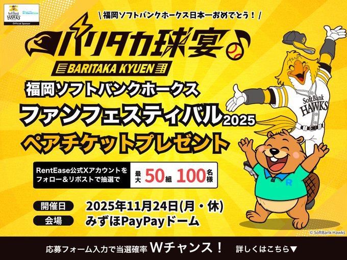 RentEase3万ダウンロード突破記念 HAWKSファンフェスチケット当たる!