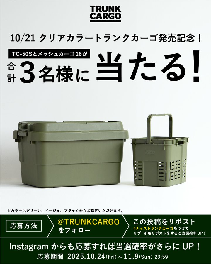 【X・Instagram懸賞】TC-50Sとメッシュカーゴ16を3名様にプレゼント 2025.11.08トランクカーゴ‐クリアカラートランクカーゴ発売記念 賞品:TC-50Sとメッシュカーゴ16(3名様) 締切:2025年11月9日(日)XとInstagramで合わせて3名様にTC-50Sとメッシュカーゴ16をプレゼント!※詳細はキャンペーンページにてご確認ください。応募はこちらから