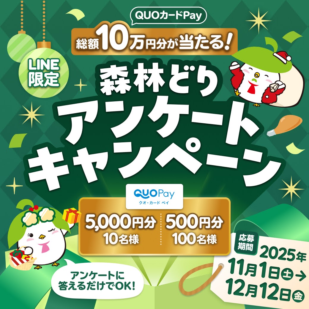 【LINE懸賞】QUOカードPay最大5,000円分を合計110名様にプレゼント 2025.11.08森林どり‐アンケートキャンペーン 賞品: ・QUOカードPay5,000円分×10名様 ・QUOカードPay500円分×100名様 締切:2025年12月12日(金)アンケートに答えてご応募ください。※詳細はキャンペーンページにてご確認ください。応募はこちらから
