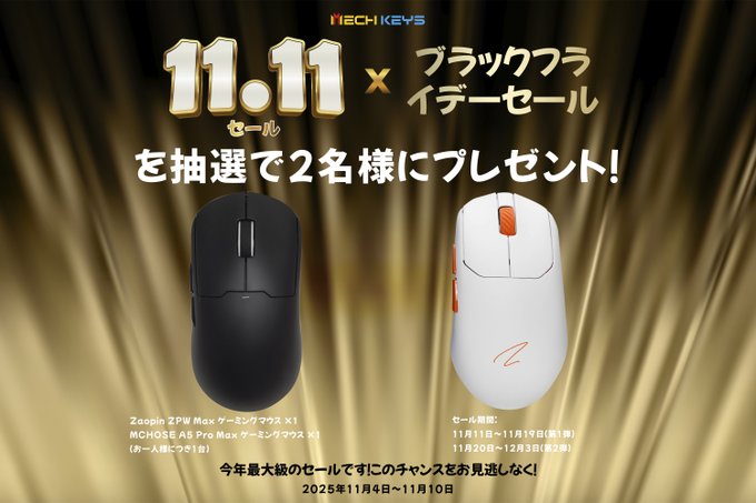【X懸賞】ゲーミングマウスを2名様にプレゼント 2025.11.08MechKeys-JP‐プレゼントキャンペーン 賞品:ゲーミングマウス(2名様) 締切:2025年11月10日(月)応募方法 1️⃣ @MechkeysJPをフォロー 2️⃣ 投稿をいいね+RP※詳細はキャンペーンページにてご確認ください。応募はこちらから