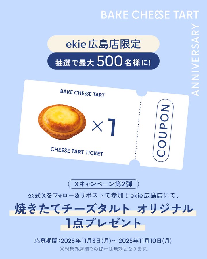 賞品:BAKE CHEESE TART ekie 広島店 焼きたてチーズタルト オリジナル 引換券(最大500名様)