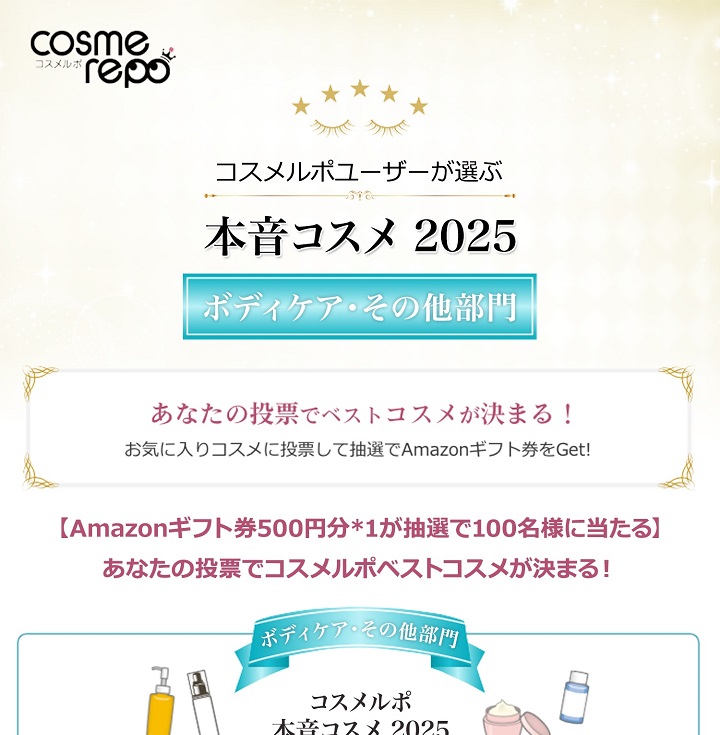 Amazonギフト券500円分を100名様にプレゼント 2025.11.09cosmerepo‐ベスコス2025④ボディケア・その他 賞品:Amazonギフト券500円分(100名様) 締切:2025年11月10日(月)お気に入りコスメに投票してご応募ください。※詳細はキャンペーンページにてご確認ください。応募はこちらから