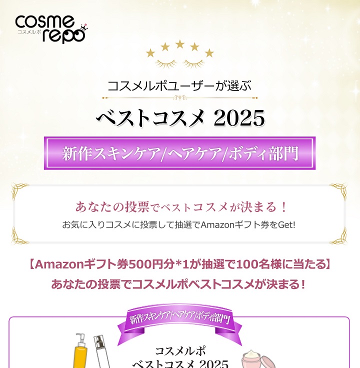 Amazonギフト券500円分を100名様にプレゼント 2025.11.09cosmerepo‐ベスコス2025⑤新作スキンケア・ヘアケア・ボディ部門 賞品:Amazonギフト券500円分(100名様) 締切:2025年11月10日(月)お気に入りコスメに投票してご応募ください。※詳細はキャンペーンページにてご確認ください。応募はこちらから