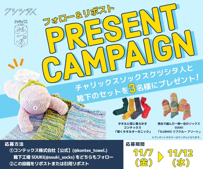@souki_socks @kontex_towel をフォロー&キャンペーン対象ポストをリポストしてご応募ください。