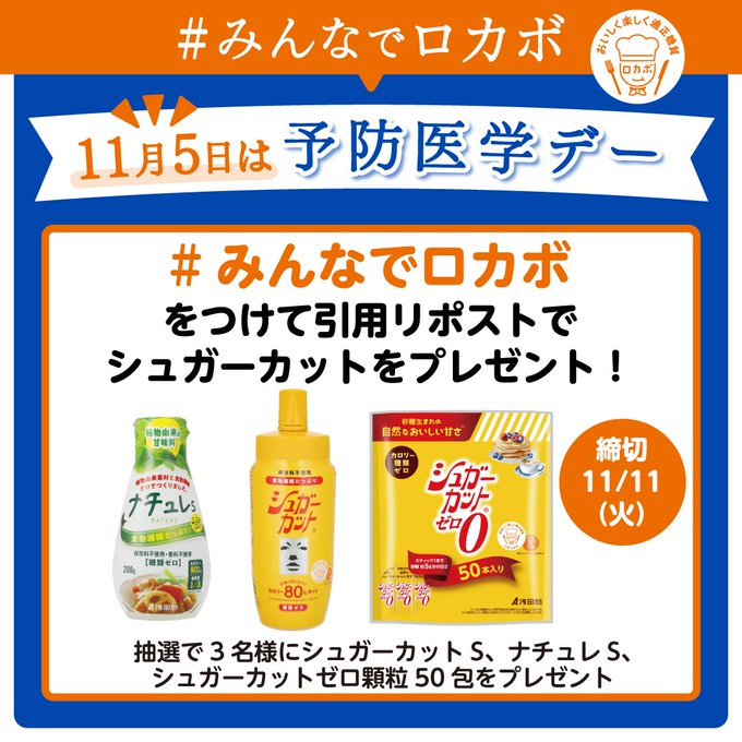 フォロー&#みんなでロカボ をつけて引用リポストで、ロカボスイーツ作りやお料理にも最適な「シュガーカットS」「ナチュレS」「シュガーカットゼロ顆粒(50本入)」を3名様にプレゼント!