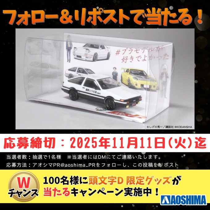 【X懸賞】頭文字D 展示ケースを1名様にプレゼント 2025.11.09アオシマPR‐フォロー&リポストキャンペーン 賞品:頭文字D 展示ケース(1名様) 締切:2025年11月11日(火)公式X(Twitter)アカウントをフォロー&キャンペーン対象ポストをリポストしてご応募ください。※詳細はキャンペーンページにてご確認ください。応募はこちらから