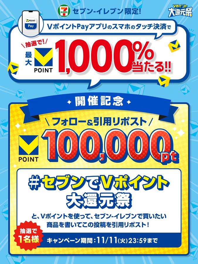 ② #セブンでVポイント大還元祭 と、あなたがVポイントを使ってセブン-イレブンで買いたい商品を書いて投稿を引用リポスト!