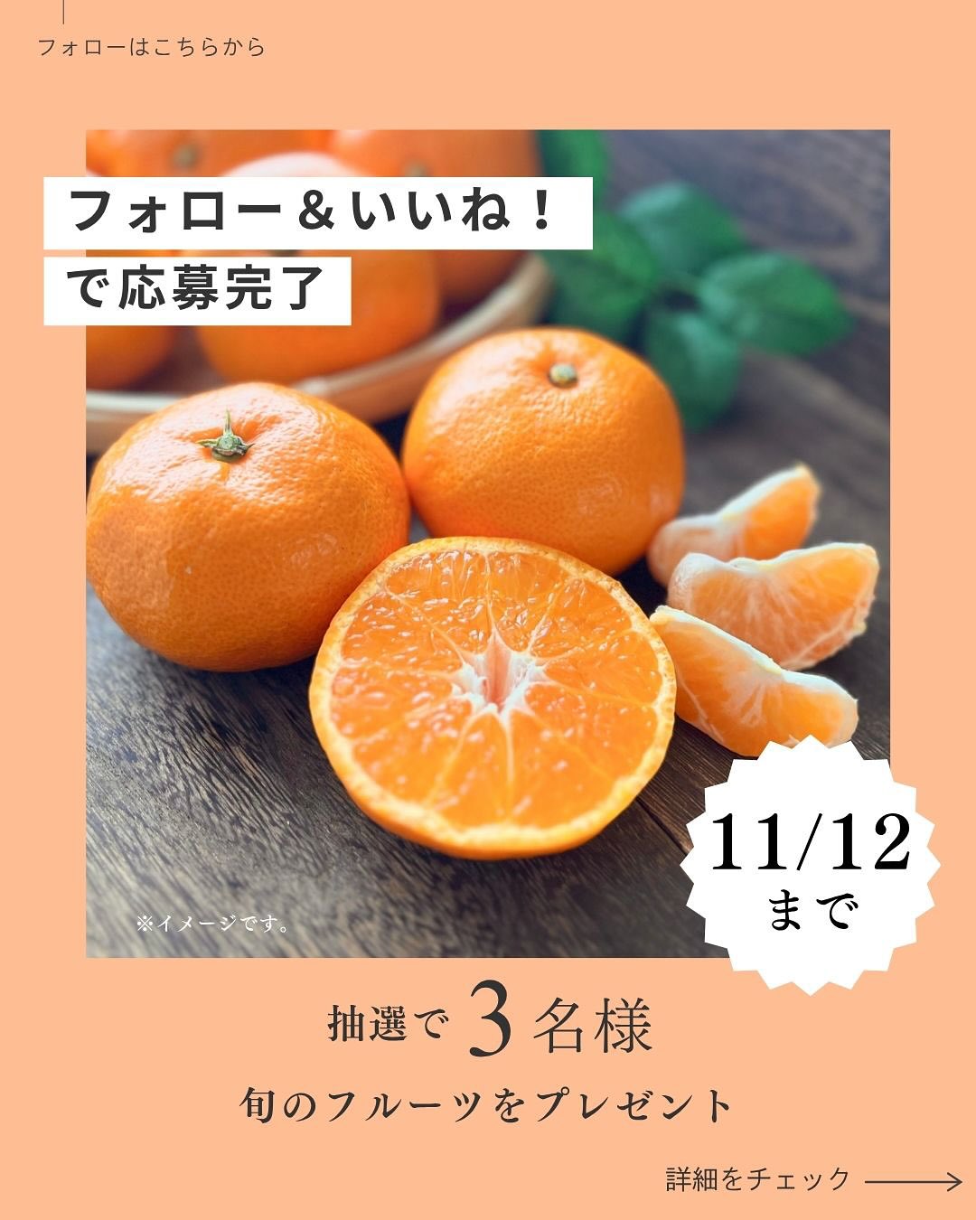 【Instagram懸賞】玉津みかん約5kgを3名様にプレゼント 2025.11.10全農広報部‐フォロー&いいねキャンペーン 賞品:玉津みかん 約5kg(3名様) 締切:2025年11月12日(水)応募方法: 1. 公式Instagramアカウントをフォロー 2. 対象の投稿に「いいね!」※詳細はキャンペーンページにてご確認ください。応募はこちらから