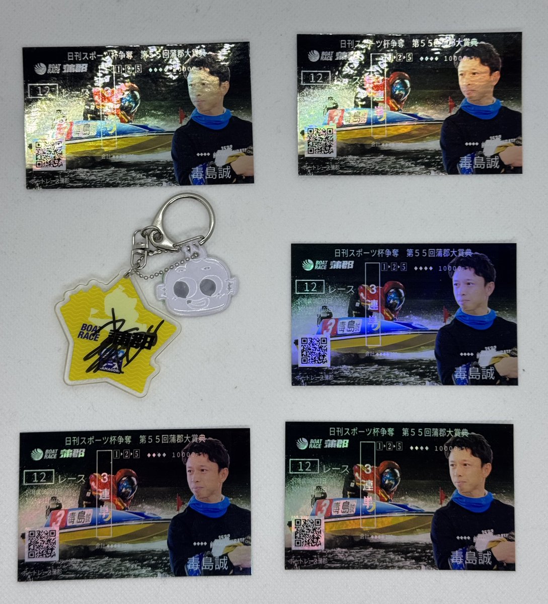 賞品:毒島選手サイン入りアクリルキーホルダー、オリジナル記念舟券(6名様)