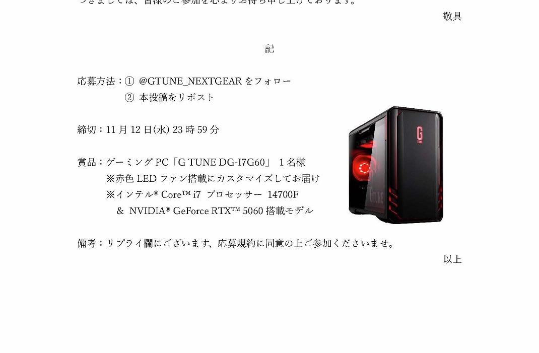 マウスコンピューター ゲーミング‐フォロー&リポストキャンペーン