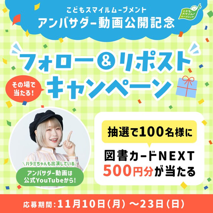 こどもスマイルムーブメント公式X(Twitter)アカウントをフォロー&キャンペーン対象ポストをリポストしてご応募ください。
