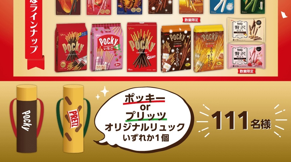 賞品:ポッキー or プリッツ オリジナルリュック いずれか1個(111名様)