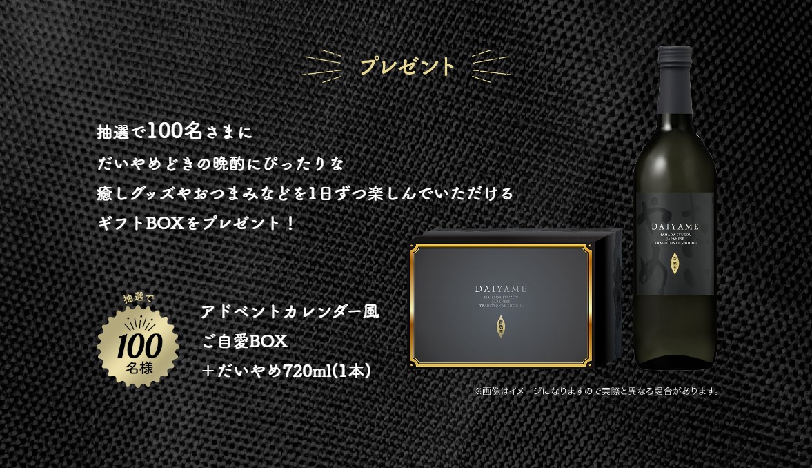 賞品:「だいやめ(720ml) 1本」「アドベントカレンダー風ご自愛BOX」(100名様)