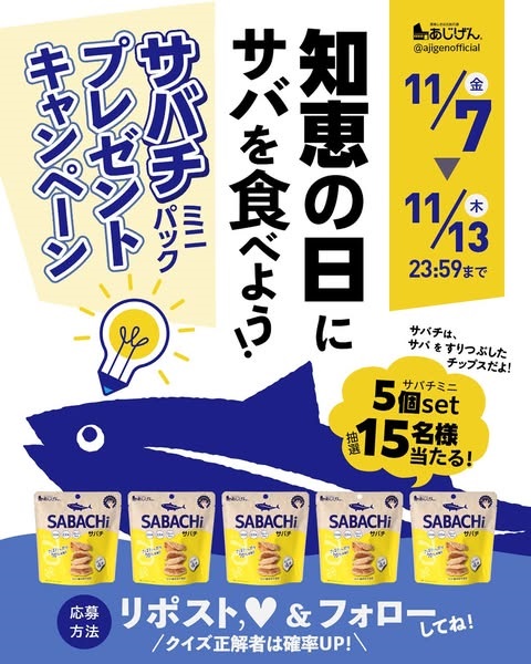 【Instagram懸賞】サバチミニパックを15名様にプレゼント 2025.11.12あじげん‐今日は知恵の日!サバチプレゼントキャンペーン 賞品:サバチミニパック(15名様) 締切:2025年11月13日(木)応募方法: 1. 公式Instagramアカウントをフォロー 2. 対象の投稿に「いいね!」※詳細はキャンペーンページにてご確認ください。応募はこちらから