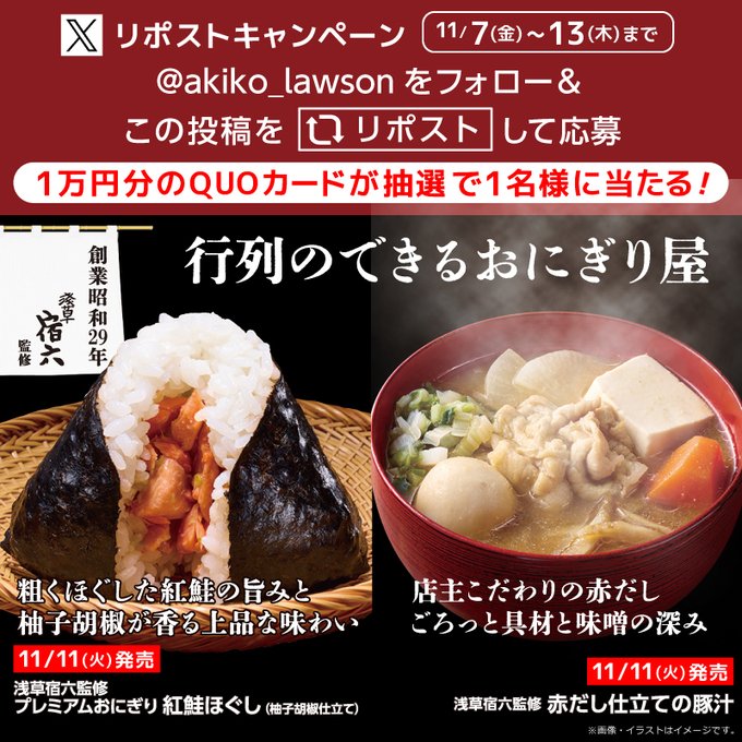 【X懸賞】QUOカード1万円分を1名様にプレゼント 2025.11.12ローソン‐フォロー&リポストキャンペーン 賞品:QUOカード1万円分(1名様) 締切:2025年11月13日(木)公式X(Twitter)アカウントをフォロー&キャンペーン対象ポストをリポストしてご応募ください。※詳細はキャンペーンページにてご確認ください。応募はこちらから