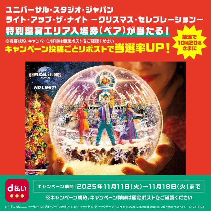 賞品:ユニバーサル・スタジオ・ジャパン クリスマス・ショー 特別鑑賞エリア入場券(ペア)(10組20名様)