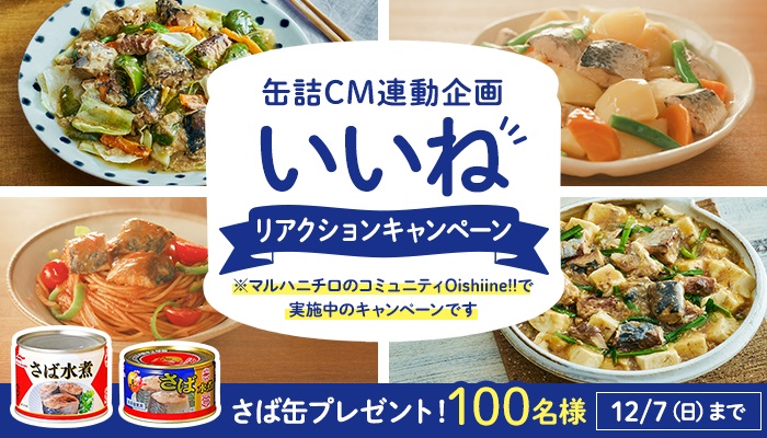 「月花さば水煮」「さば水煮」を100名様にプレゼント 2025.11.12Oishiine!!‐缶詰CM連動企画 賞品:『月花さば水煮』『さば水煮』(100名様) 締切:2025年12月7日(日)レシピにリアクションしてさば缶をゲット!※詳細はキャンペーンページにてご確認ください。応募はこちらから