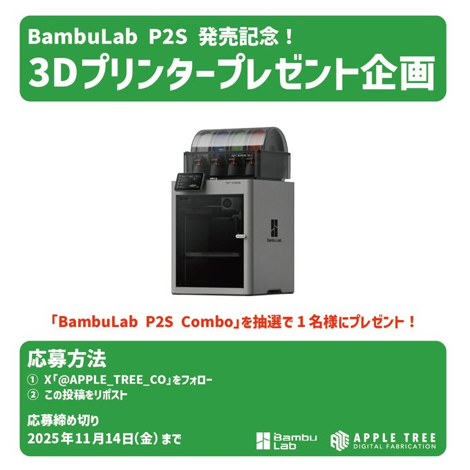 賞品:3Dプリンター『BambuLab P2S Combo』(1名様)