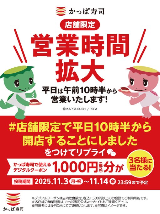 賞品:かっぱ寿司デジタルクーポン1000円分(3名様)