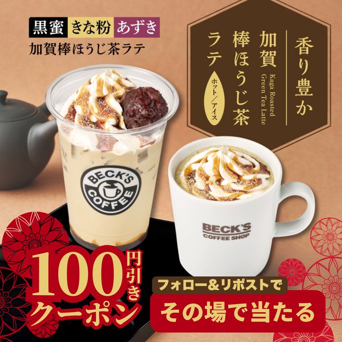 賞品:ベックスコーヒーで使える「黒蜜きな粉あずき 加賀棒ほうじ茶ラテ」100円引きクーポン(1,000名様)