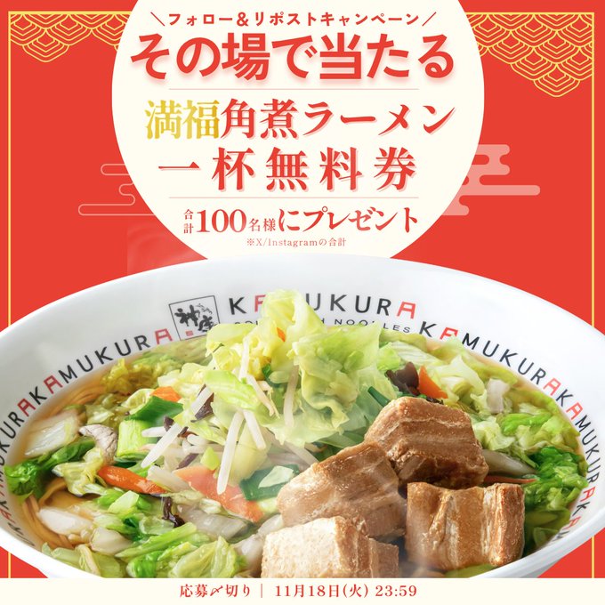 賞品:満福角煮ラーメン一杯無料券(100名様)