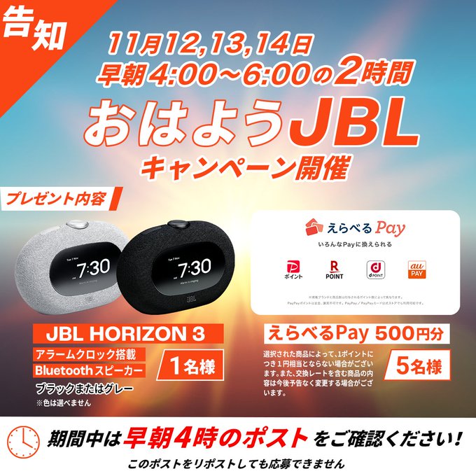 アラームクロック搭載Bluetoothスピーカー『JBL HORIZON 3』 1日1名様