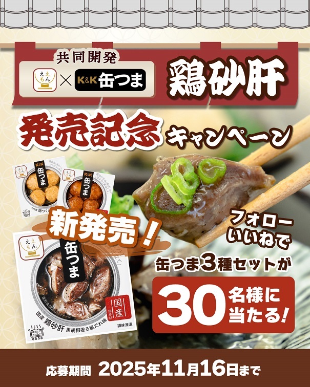 賞品:新発売 缶つま鶏砂肝 入りセット(30名様)