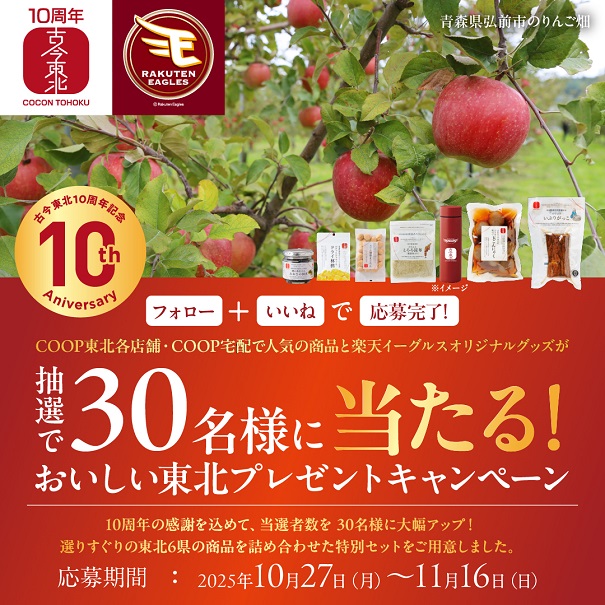 賞品:古今東北選りすぐりの東北6県の商品を詰め合わせた特別セットと楽天イーグルスオリジナルグッズ(30名様)