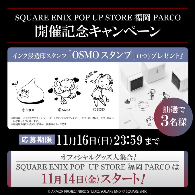 賞品:#DQ #FF #NieR いずれかの絵柄が入ったOSMOスタンプ1つ(3名様)