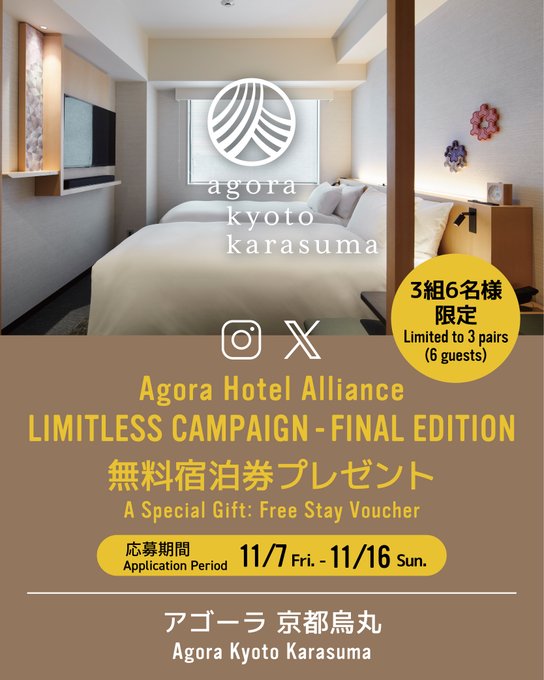 【X・Instagram懸賞】「アゴーラ 京都四条」ペア無料宿泊券を1組2名様にプレゼント