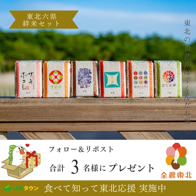 【X懸賞】東北六県絆米セットを3名様にプレゼント 2025.11.14JAタウン‐フォロー&リポストキャンペーン 賞品:東北六県絆米セット(3名様) 締切:2025年11月16日(日)公式X(Twitter)アカウントをフォロー&キャンペーン対象ポストをリポストしてご応募ください。※詳細はキャンペーンページにてご確認ください。応募はこちらから