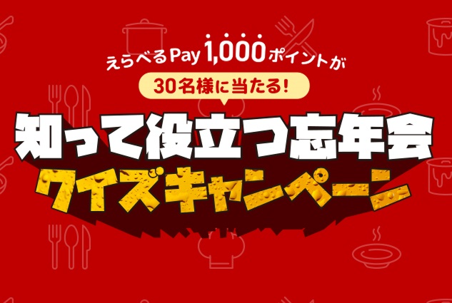 【アプリ】えらべるPay1,000ポイントを30名様にプレゼント 2025.11.14QAQA‐知って役立つ忘年会クイズキャンペーン 賞品:えらべるPay1,000ポイント(30名様) 締切:2025年11月18日(火)忘年会にまつわるクイズをQAQAで出題中!クイズに答えて、えらべるPayを当てよう!※詳細はキャンペーンページにてご確認ください。応募はこちらから