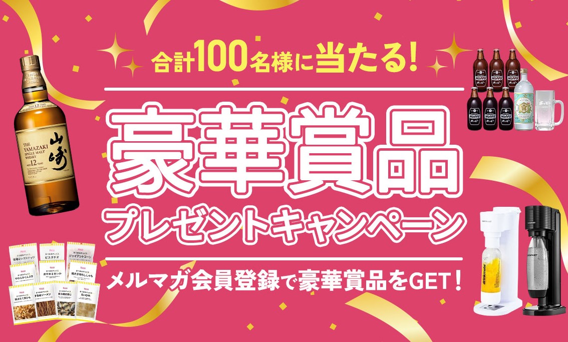 サントリー山崎12年、ソーダストリームTERRAまたはドリンクメイト、ホッピースターターセット、Kprice おつまみ10点セットを合計100名様にプレゼント