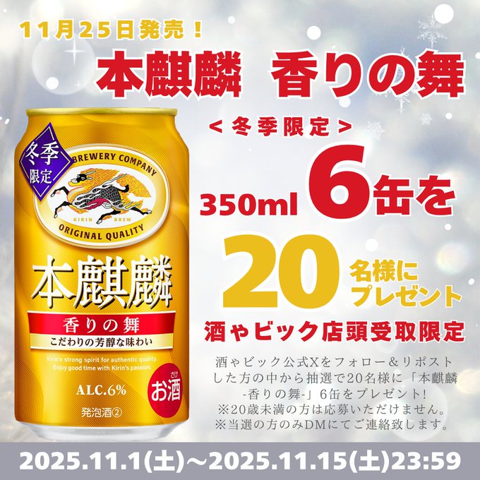 賞品:本麒麟 香りの舞 350ml 6缶 店頭引き換え(20名様)