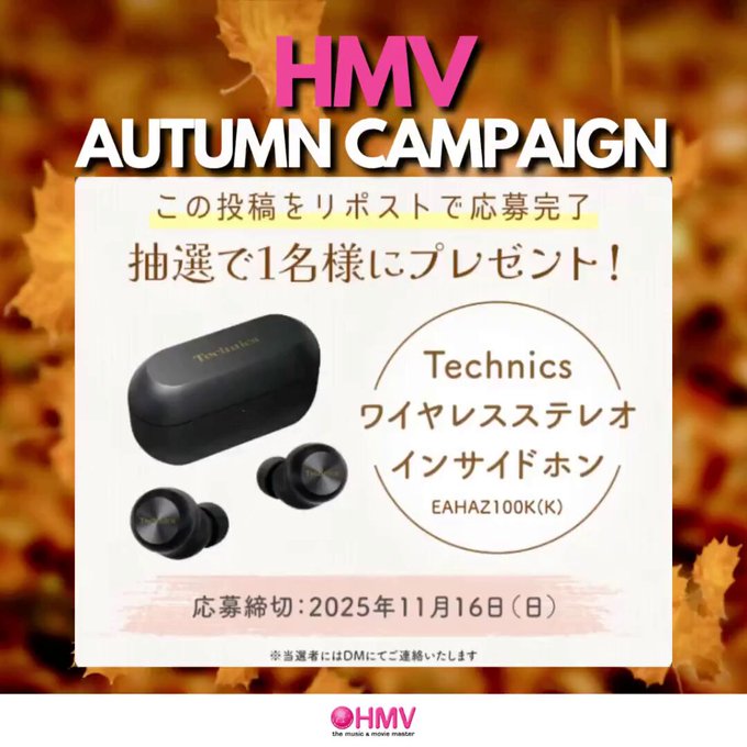 【X懸賞】ワイヤレスイヤホンを1名様にプレゼント 2025.11.15HMV AUTUMN CAMPAIGN 賞品:ワイヤレスイヤホン(1名様) 締切:2025年11月16日(日)対象ポストをリポストしてご応募ください。※詳細はキャンペーンページにてご確認ください。応募はこちらから