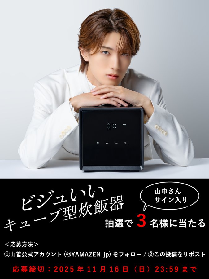賞品:山中柔太朗さんサイン入りビジュいいキューブ型炊飯器(3名様)