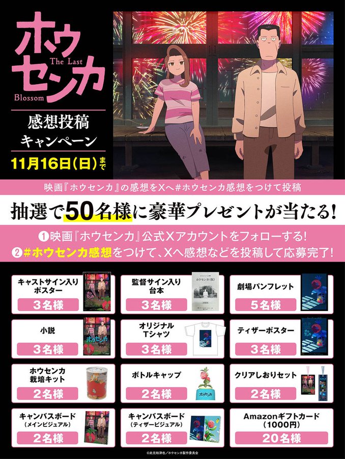 賞品:映画『ホウセンカ』サイン入りポスター、グッズ、Amazonギフト券1,000円分(50名様)