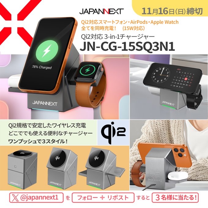 【X・Instagram懸賞】JAPANNEXT初の3 in 1 ワイヤレスチャージャーを3名様にプレゼント