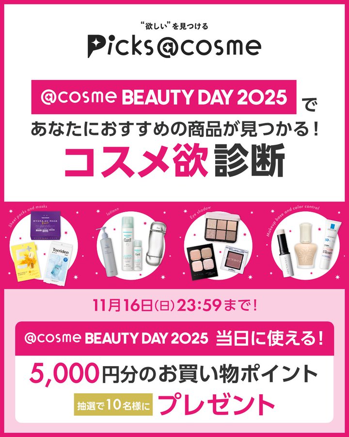 【X懸賞】5,000円分のお買い物ポイントを10名様にプレゼント 2025.11.15アットコスメ‐プレゼントキャンペーン 賞品:5000円分のお買い物ポイント(10名様) 締切:2025年11月16日(日)診断結果をXにポストすると 5000円分のお買い物ポイントが抽選で10名様に当たる!🎁※詳細はキャンペーンページにてご確認ください。応募はこちらから