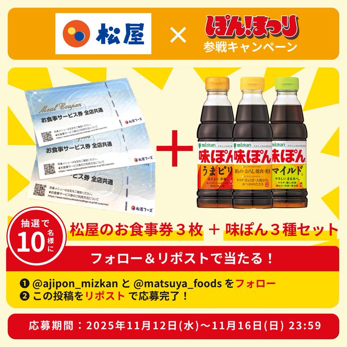 @ajipon_mizkan @matsuya_foods をフォロー&キャンペーン対象ポストをリポストしてご応募ください。