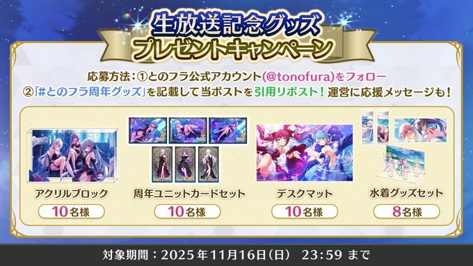 2:ハッシュタグ #とのフラ周年グッズ と希望のプレゼント名を記入してポストを引用リポスト!
