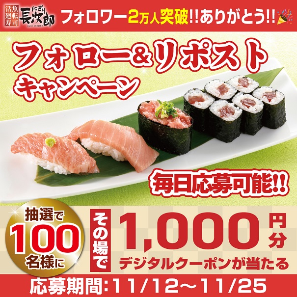 賞品:にぎり長次郎・CHOJIROでご利用いただける1,000円分のデジタルクーポン券(100名様)