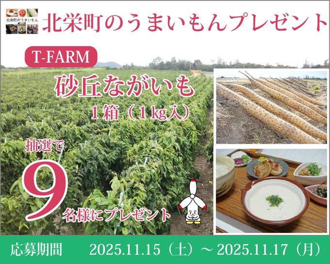 賞品:T-FARMの「砂丘ながいも1箱(1kg)」(9名様)