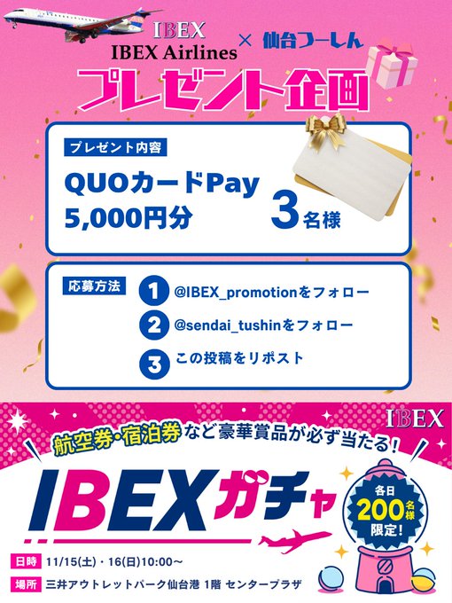 @IBEX_promotion @sendai_tushin をフォロー&キャンペーン対象ポストをリポストしてご応募ください。