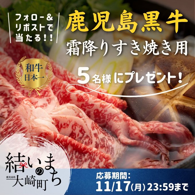 賞品:鹿児島黒牛 霜降りすき焼き用 約500g(ロースまたは肩ロース)(5名様)